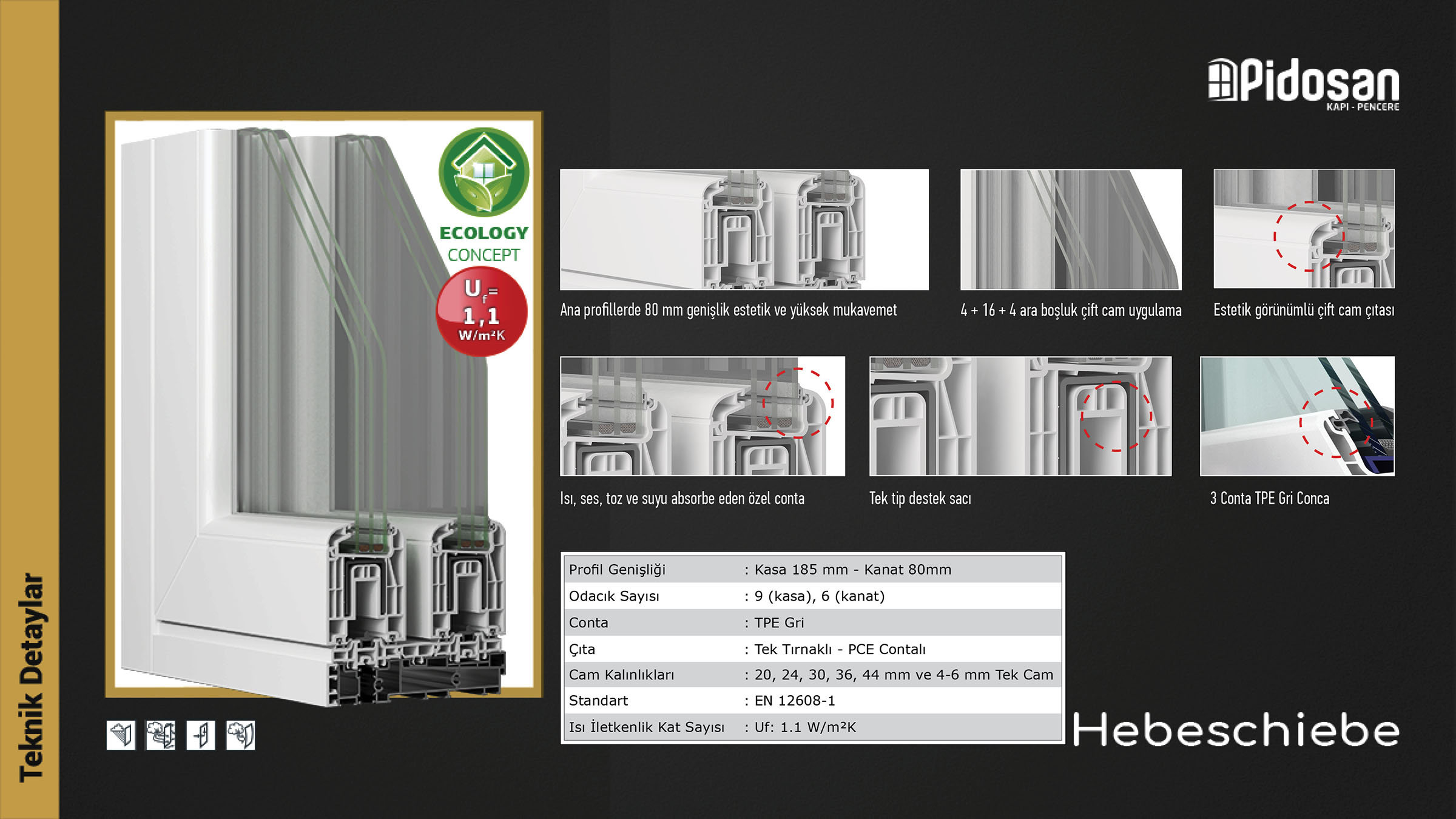 Pidosan Hebeschiebe PVC Sürme Sistemi’nin tasarımında, hem profillerde hem de detaylarda izolasyon kavramı ön planda tutulmuştur. Kanatlar 5 odacıklıdır. Kanatlarda yüksek atalet moment değerine sahip destek sacı kullanımı ile geniş açıklıklarda doğramalar yapılabilmektedir. Alt kasa olarak, hem alüminyum kasa hem de PVC kasa kullanma imkânı bulunmaktadır. Sistemde özel contalar kullanılarak, sisteme mükemmel izolasyon kazandırılması amaçlanmıştır. Sistemde ayrıca, değişik kalınlıklarda cam uygulaması yapılabilmektedir.